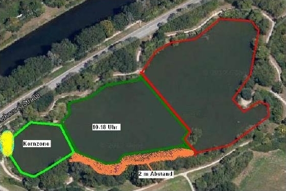 - Generell sollten 2 m Abstand vom Ufer gehalten werden. Dieses betrifft besonders die unserem Gelände gegenüberliegende Seite ab Höhe der Halbinsel